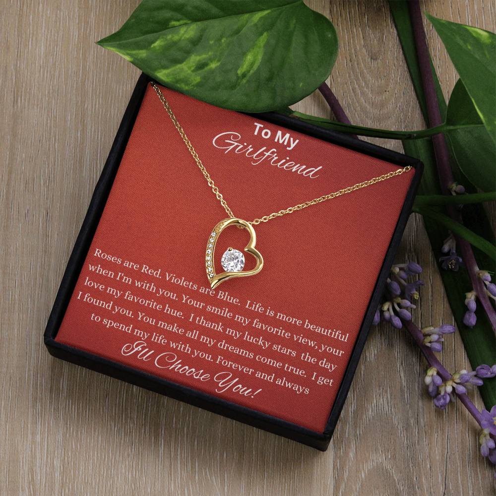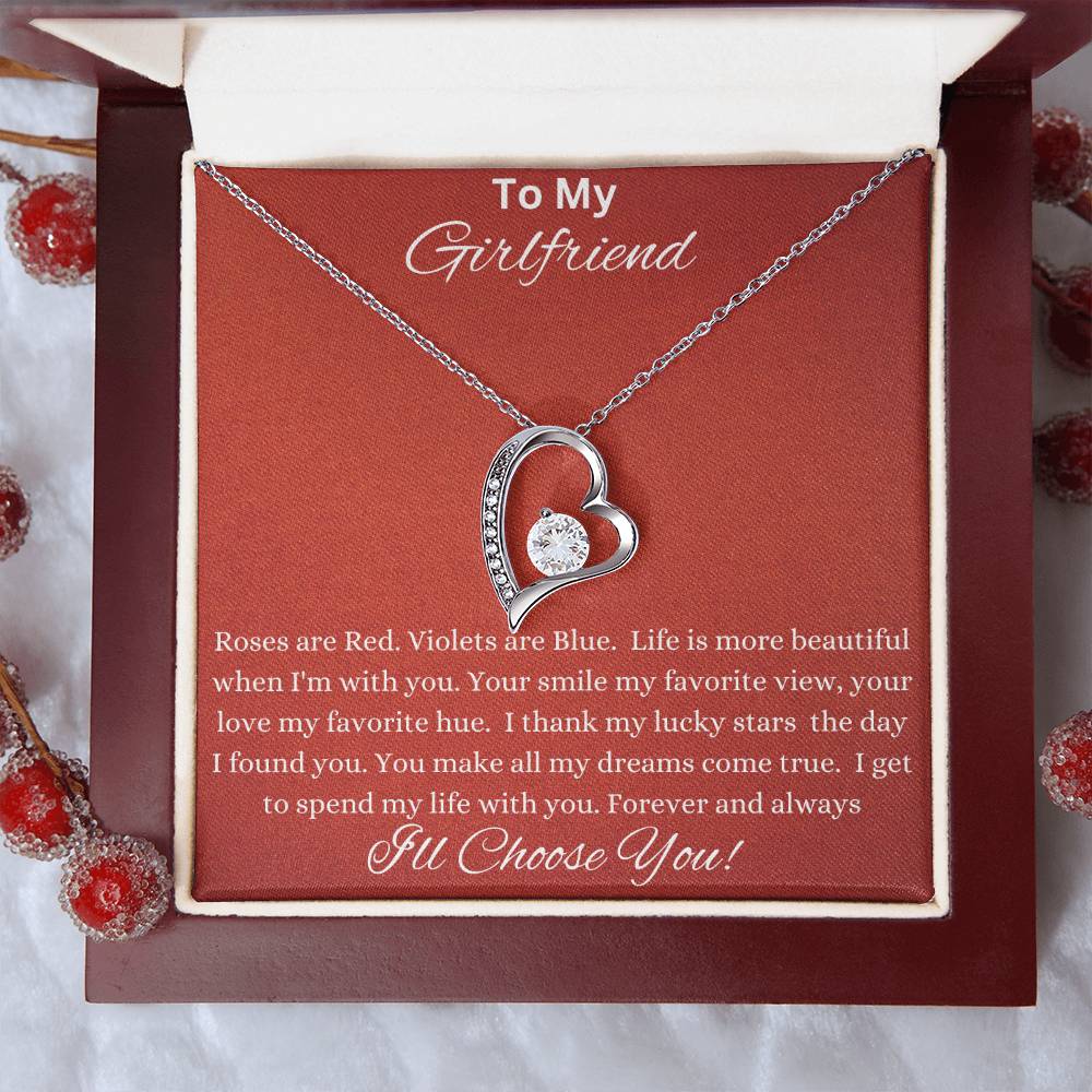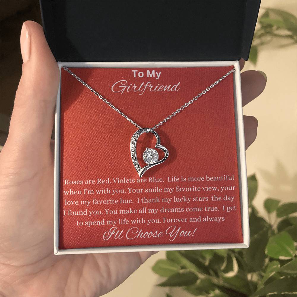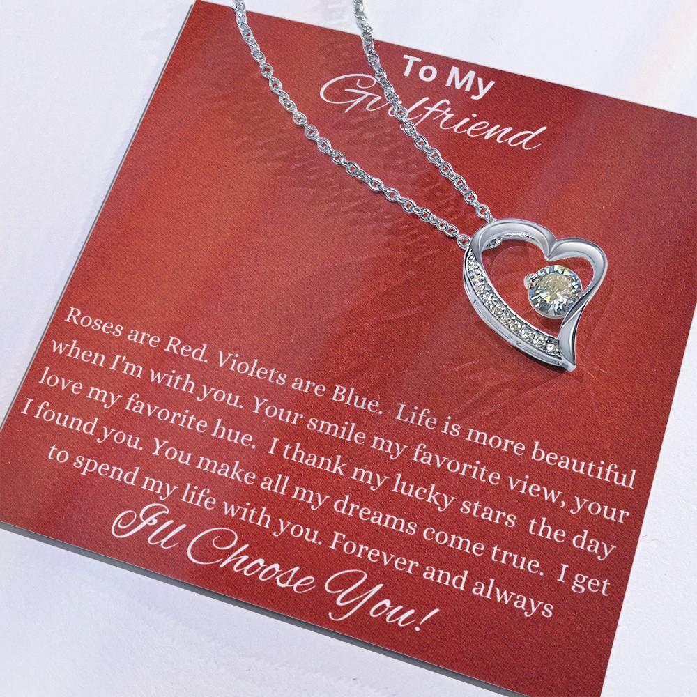 To My Girlfriend: Roses are Red. Violets are Blue. Life is more beautiful when I'm with you. Your smile my favorite view, your love my favorite hue. I thank my lucky starts the day I found you. You make all my dreams come true. I get to spend my life with you. Forever and Always I'll Choose You!