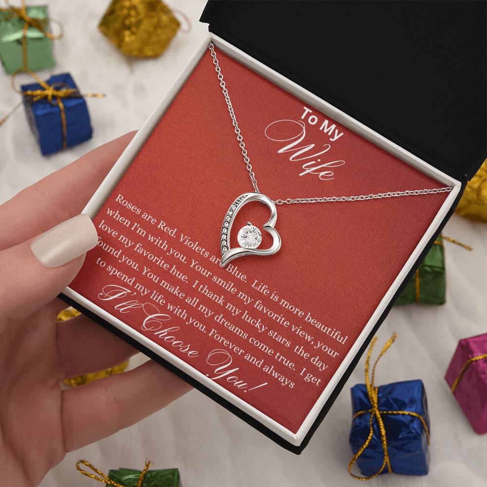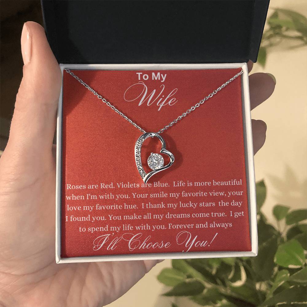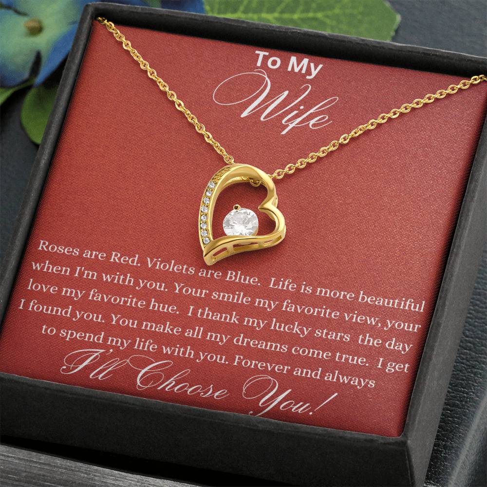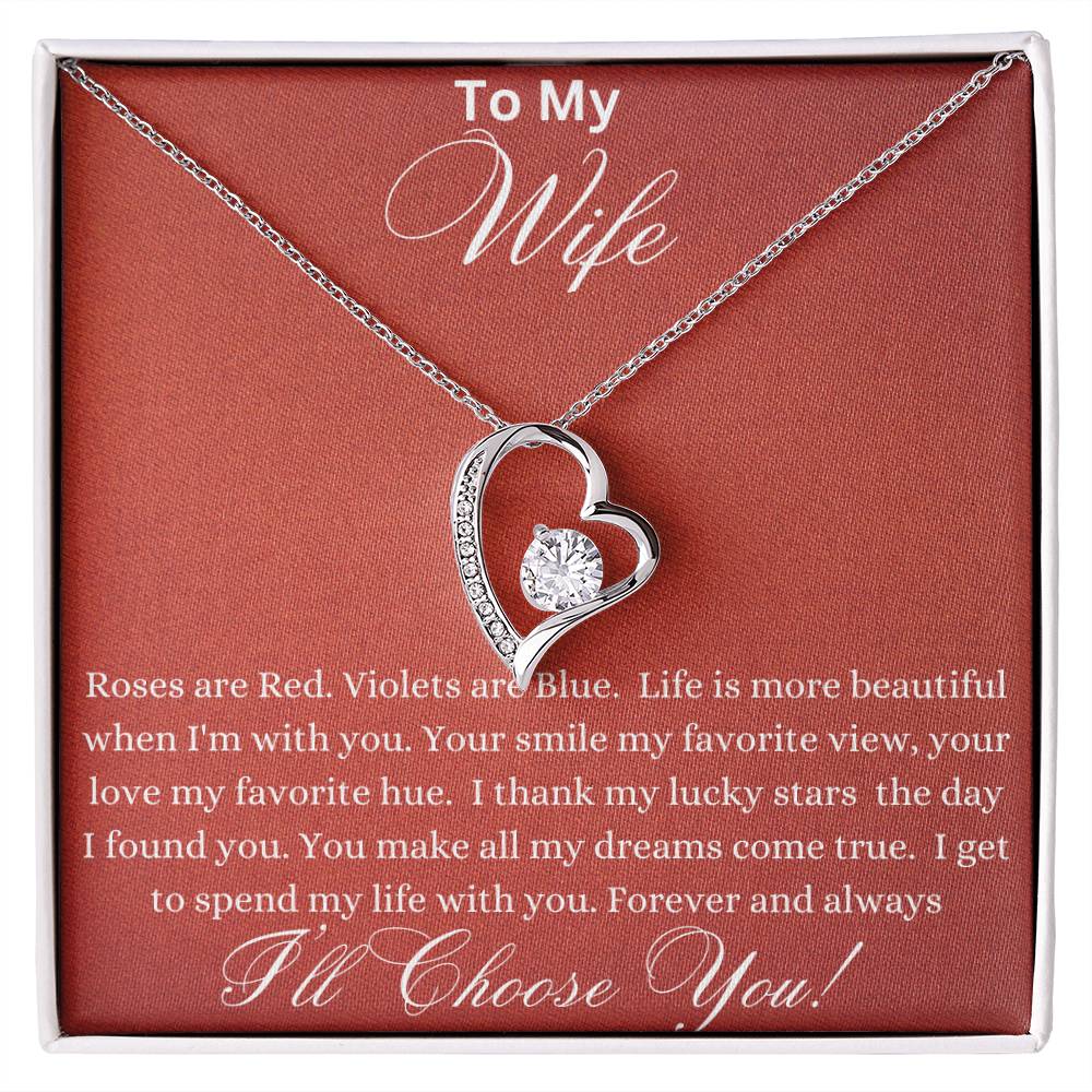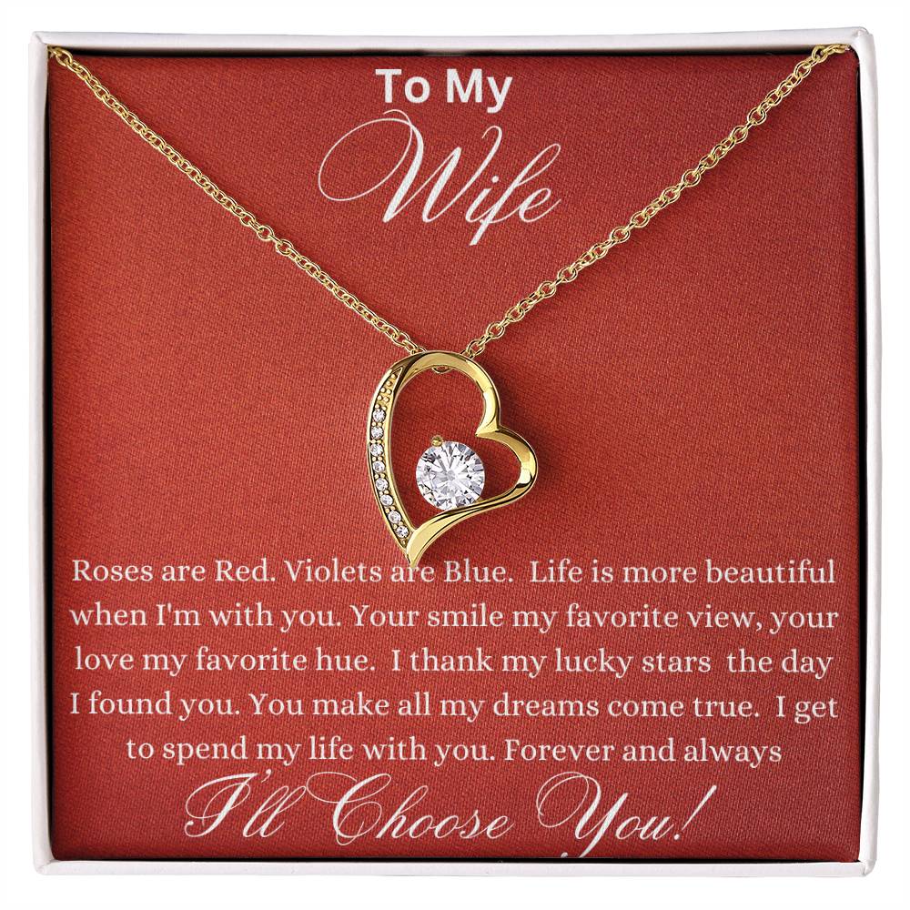 To My Wife: Roses are Red. Violets are Blue. life is more beautiful when I'm with you. Your smile my favorite view, your love my favorite hue. I thank my lucky stars the day I found you. You make all my dreams come true. I get to spend my life with you. Forever and Always I'll Choose You!