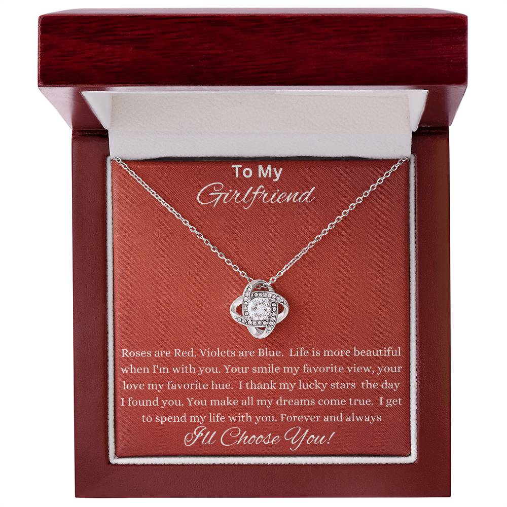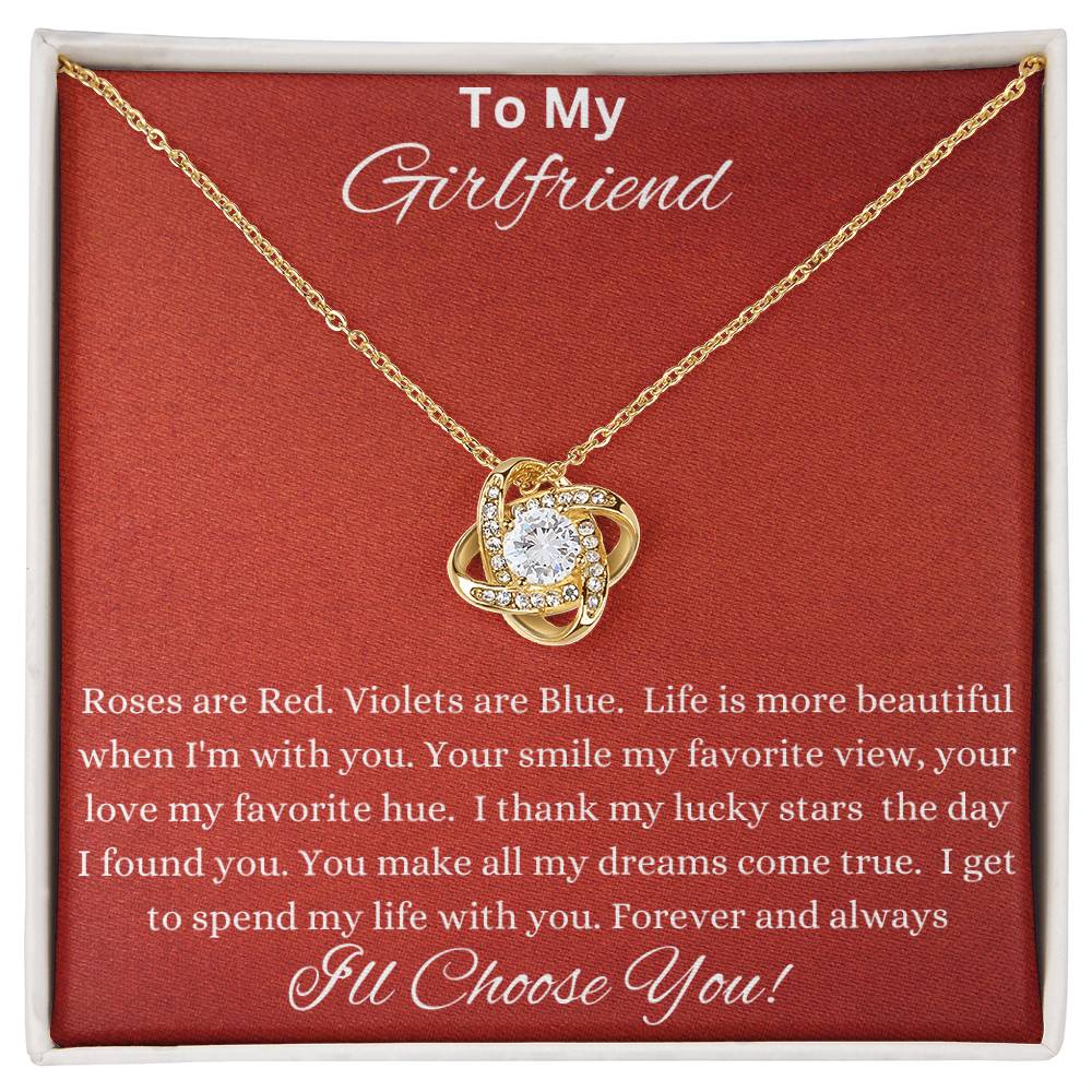 To My Girlfriend: Roses are Red. Violets are Blue. Life is more beautiful when I'm with you. Your smile my favoite view, your love my favorite hue. I thank my lucky stars the day I found you. You make all my dreams come true. I get to spend my life with you. Forever and Always I'll Choose You!