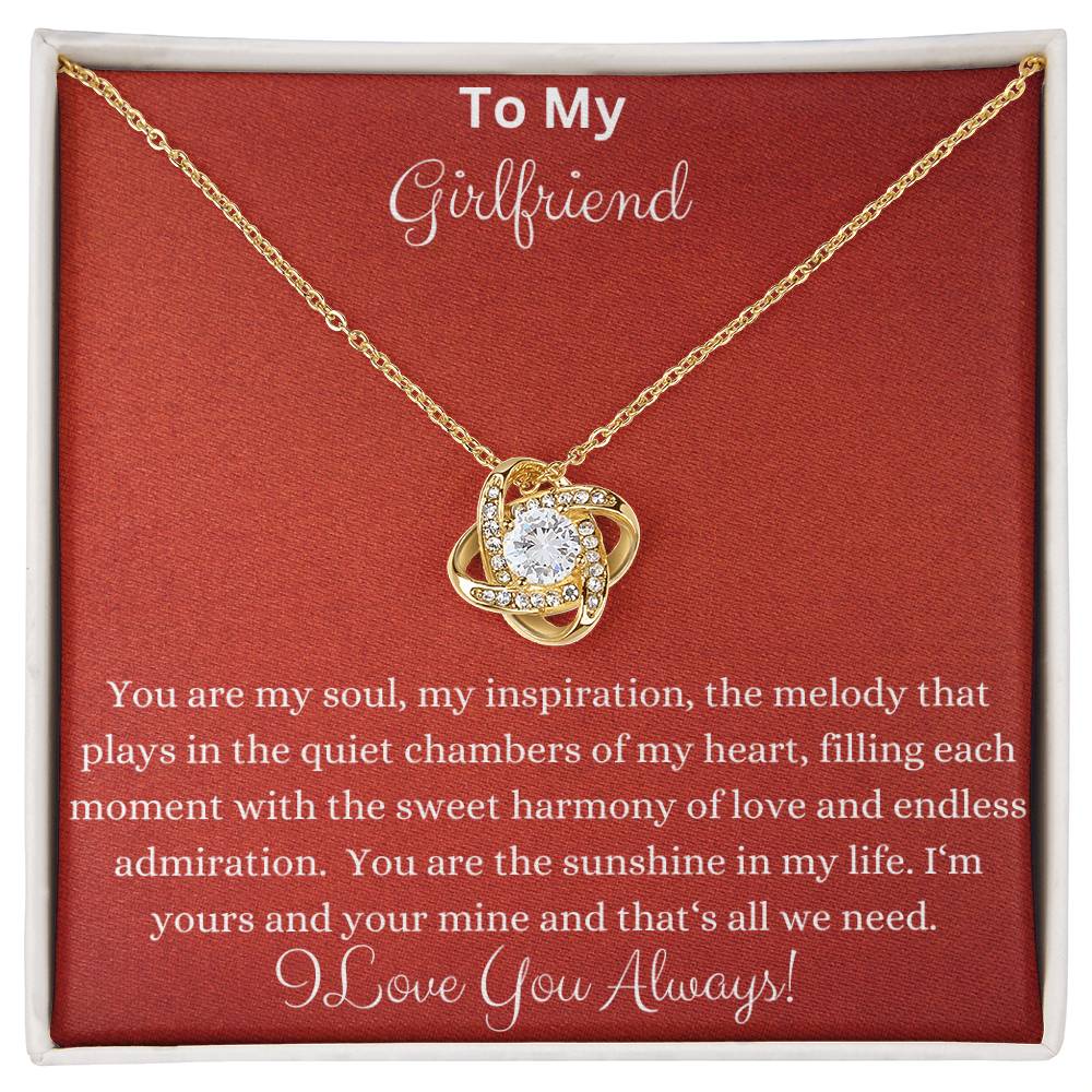 To My Girlfriend: You are my sould, my inspiration, the melody that plays in the quiet chambers of my heart, filling each moment with the sweet harmony of love and endless admiration. You are the sunshine in my life. I'm yours and your mine and that's all we need. I Love You Always!